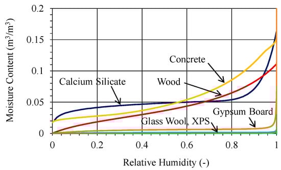 The hygrothermal material properties used in the calculation included the specific heat, thermal conductivity, moisture sorption isotherm, and vapor permeability. Figure 6 shows the moisture sorption isotherms of the calcium silicate board, wood, concrete, gypsum board, glass wool, and XPS used in the analysis. The quantity of water vapor adsorbed by the calcium silicate board was measured at various values of RH by using the gas-absorption method (Belsorp Max, Microtrac BEL Corp.). The results were used to determine the moisture sorption isotherm. The other hygrothermal properties and densities used in the study are listed in Table 4; they were taken from the literature [35,36,37,38]. The density and specific heat values were for the dry state. The vapor permeability for the water vapor pressure gradient was converted to and and used in the calculations. The values of thermal conductivity and vapor permeability were taken at 20 °C and in the range of 10−90% RH. For concrete, and were described as functions of the moisture content, where the value of varied between 5.56 × 10−15 and 1.66 × 10−13, and that of between 5.25 × 10−11 and 1.40 × 10−9 at 20°C and 10–90% RH.