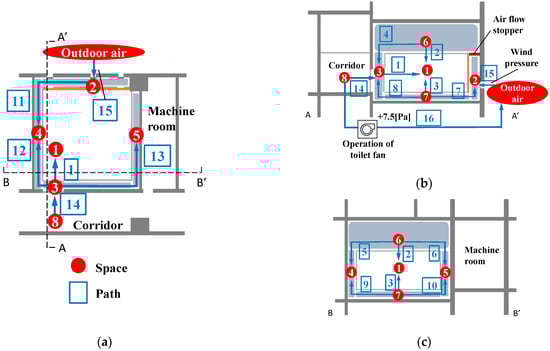 where the unit airflow rate, , is the volume flow rate of air at a pressure difference of 1 Pa over the path. The static pressure at the floor level in each space and the mass flow rate of air through each path were determined simultaneously using the Newton–Raphson method so that the net mass flow rate of air entering each space was zero [30].