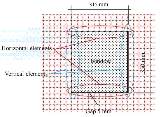 The simulated multizone airflow network, comprising of eight spaces (the room, four side buffer spaces, attic space, crawl space, the corridor, and 16 paths), is shown in Figure 7. The gaps in the windows and doors were divided into vertical and horizontal elements (as shown in Figure 8), and each was assigned a unit airflow rate. In this study, the air leakage characteristic value, discharge coefficient,, and gap area, were used to determine the unit airflow rate,, as follows: