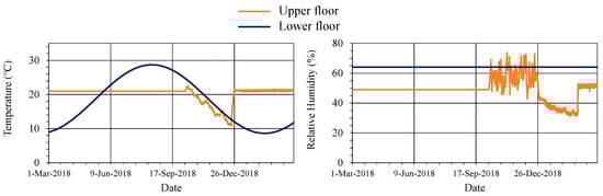 The temperature and RH of the east and west rooms of the subject storage room, corridor, outdoor air, and upper- and lower-floor rooms (the blue circles in Figure 4a,b) were input-based on the measured data and updated at each time step of the analysis. The values of temperature and RH were assumed to change linearly during the measurement interval. The temperatures and RHs in the storage room, the attic space, the northern buffer space, the south corridor, the adjoining rooms to the east and west, and the room directly above were also measured [4]. The measurements started in February 2018, except for the room on the upper floor, whose data were not available until early October 2018. Figure 9 shows the temperatures and RHs in the upper and lower floors of the storage room used in the calculations. For the upper-floor room, the setpoint of the AC system (21 °C, 49% RH) was assumed as the input data before the measurements started. The AC system was unintentionally stopped and restarted on 21 December 2018. Furthermore, the humidifier of the AC system was out of order for approximately two months after the AC system restart, and thus the RH was lower.