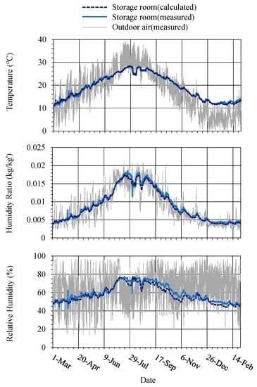 The calculated and measured temperatures, humidity ratios, and RHs in the storage room are shown in Figure 10. The measured humidity ratio is the value converted from the measured temperature and RH. The annual mean absolute errors between the calculated and measured values of temperature, humidity ratio, and RH were 0.36 °C, 0.00041 kg/kg’, and 2.7% RH, respectively, and, thus, we concluded that the numerical model reasonably simulated the measured values. The calculated RH exceeded 45% during the year and reached 70% in the summer months, similar to the measured results.