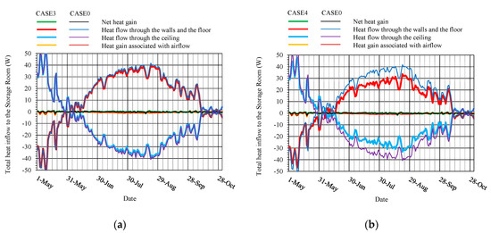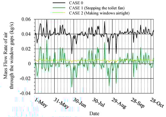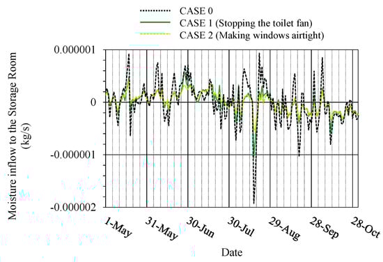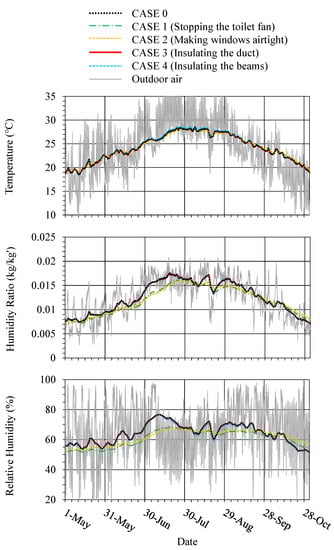 The authors conducted the analysis for CASES 0–4 listed in Table 6 and compared the calculated temperature and humidity in the storage room for CASES 1–4 to the baseline CASE 0, focusing on the summer months (June–September). In CASE 1, the operation of the lavatory fan was stopped to prevent moisture gain associated with the inflow of humid outdoor air, and, thus, there was no additional pressure in path 16. In CASE 2, assuming that the windows facing the outdoor air were made airtight, the unit airflow rate through the gaps in the windows was reduced to 10%. In CASE 3, to reduce the indirect cooling by the AC system, the duct insulation (glass wool) was modified by changing its thermal conductivity value to that in dry conditions. In CASE 4, a 50 mm layer of XPS was attached to the uninsulated RC beam to improve the thermal insulation. The thickness of XPS for one-dimensional calculations was estimated to be 23.2 mm from the preliminary two-dimensional heat transfer simulation.