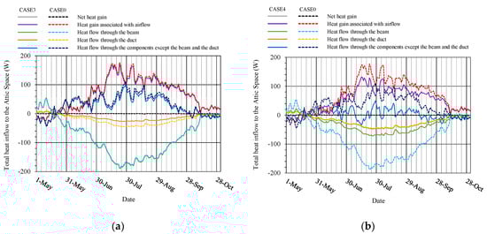 For the heat flow from the duct, UAduct (TUpper FloorTAttic space; W) was added to the heat balance of the attic space, assuming the heat transmission coefficient, U, as 1.25 W/ m2·K and the duct area, Aduct, as 5.26 m2 (TUpper Floor and TAttic space indicate the temperature of the upper floor and that of the attic space, respectively). The condensation on the surface of the duct would likely occur, leading to a degradation in the insulation performance of glass wool. In this numerical model, the thermal conductivity of wet glass wool was assumed to be 0.07 W/m·K, which was twice as high as in dry conditions.