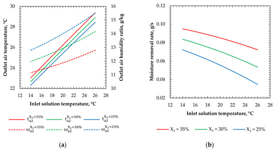 In order to investigate the effect of the inlet solution temperature on the performance of the dehumidification module, an evaluation was conducted under various solution temperatures in the range of 14–26 °C. The simulations were carried out under various solution concentrations in the range of 25–35%. The inlet air temperature, the inlet air-humidity ratio, the air mass flow rate, and the solution mass flow rate were constant and equal to 30 °C, 18.0 g/kg, 50 kg/h, 50 kg/h, respectively. As shown in Figure 8a, with the increase of solution temperature, the outlet air temperature also increases from 23.0 °C to 29.4 °C at X1 of 35%, from 22.7 °C to 28.9 °C at X1 of 30% and from 22.3 °C to 28.5 °C at X1 of 25%. An increase in the inlet solution temperature leads to a lower heat transfer between air and solution. This was indicated by a significant drop in the sensible effectiveness, as presented in Figure 8c. For instance, as the inlet solution temperature increases, the obtained sensible effectiveness drops from 0.44 to 0.16, taking into account the solution concentration of 35%. For the diluted desiccant solutions (25%, 30%), the effect of an increase in solution temperature was less significant. However, it corresponds to lower absorption of moisture by the solution.