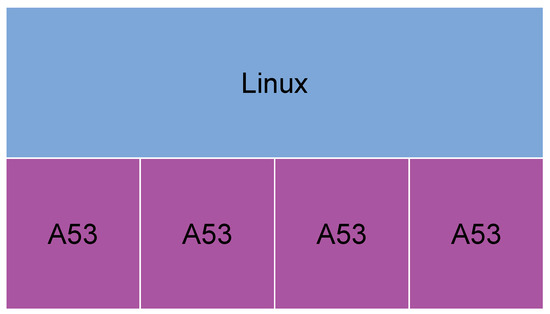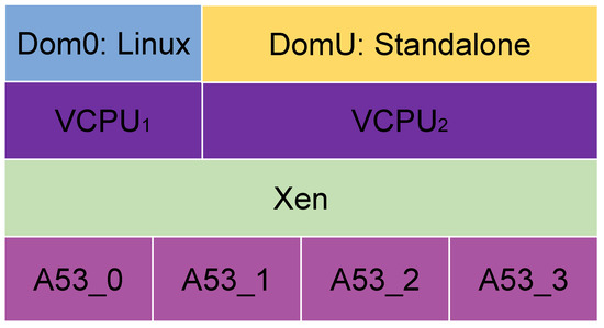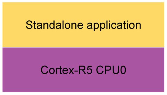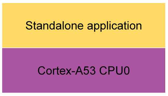 In the first scenario, there is not an OS, and the application runs directly on the hardware, on a Cortex-A53 core (Figure 5), the general-purpose one. In the second, the application runs directly on the hardware too, on a Cortex-R5 core (Figure 7), the real-time processing one. In the third, a Linux OS runs on the four Cortex-A53, which are the cores used for general-purpose application processing, while the bare-metal application runs on one of the Cortex-R5s (Figure 8). In the fourth scenario, Xen runs on the four Cortex-A53 cores, and a Linux OS runs on Xen Dom0, while the bare-metal application runs on another domain (Figure 6).