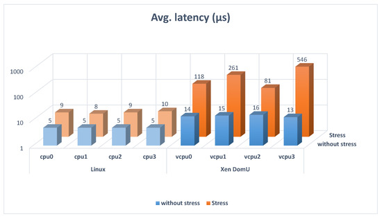 When some determined time constraints are needed, interrupts are essential. Interrupts are commonly used in many utilities of the MPSoC boards and measuring them can be helpful in many applications. Additionally, it is interesting to characterize the latencies in a stressful situation to see the worst-case latency. Stress-ng forces the system in various ways. It exercises some physical subsystems and OS kernel interfaces. It also supports some CPU-specific stress tests. The stress-ng command runs in Xen Dom0 to stress the kernel in the scenario of Figure 6 and in the Linux part in the scenario of Figure 8.
