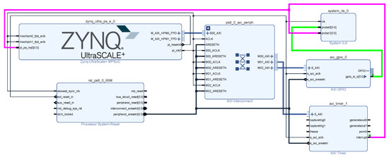 In these scenarios, the GPIO interrupt latency has been measured from the PL side of the board. A hardware design has been made with a PS block, an AXI GPIO and an AXI Timer in Vivado (Figure 9):