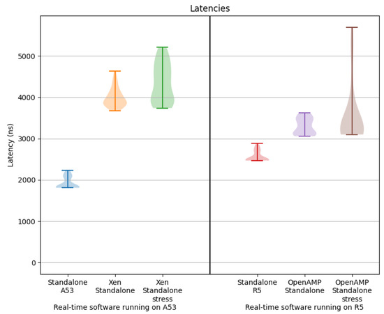 In this context, Cyclictest is executed, which is a tool to measure the difference between a thread’s intended wake-up time and the time at which it actually wakes up, in four scenarios: (1) a Linux OS running on the four A53 cores, (2) a Linux OS running on the four A53 cores with stress, (3) a Linux OS running on Xen’s DomU and (4) a Linux OS running on Xen’s DomU with stress in Dom0. It is shown that these scenarios are not suitable for real time, so another test scenario has been evaluated, where the latency of handling, in the PS part, an interrupt generated on the PL side is measured. The GPIO interrupt latencies in six scenarios are: (1) a standalone application running on an A53 core, (2) a standalone application running on an R5 core, (3) a standalone application running on a Xen domain while a Linux OS is running on Xen Dom0 without stress, (4) a standalone application running on an R5 core while a Linux OS is running on the A53 cores using OpenAMP without stress, (5) a standalone application running on a Xen domain while a Linux OS is running on Xen Dom0, stressing it, and (6) a standalone application running on an R5 core while a Linux OS is running on the A53 cores using OpenAMP stressing the A53 cores. Then, we evaluated if these scenarios meet the 3 ms latency constraint.