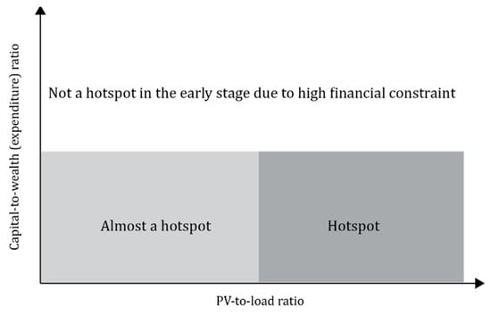 Figure 1 illustrates the concept of the rooftop PV hotspot. An area with a high PV-to-load ratio and a low capital-to-wealth ratio is likely to be a rooftop PV hotspot in the early stage of PV market development (dark grey area). This is because the representative customer in this area already faces a lower financial constraint (low capital-to-wealth ratio) and can afford to invest up to the large optimal rooftop PV size (high PV-to-load ratio). The light grey area indicates the area where the customer can afford to invest in the optimal rooftop PV size (low capital-to-wealth ratio), but the optimal PV sizes may not be as high as in the dark grey area (low PV-to-load ratio). By contrast, customers in the top area in Figure 1 have higher capital-to-wealth ratios and will likely be late adopters of rooftop PV.