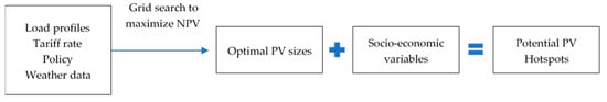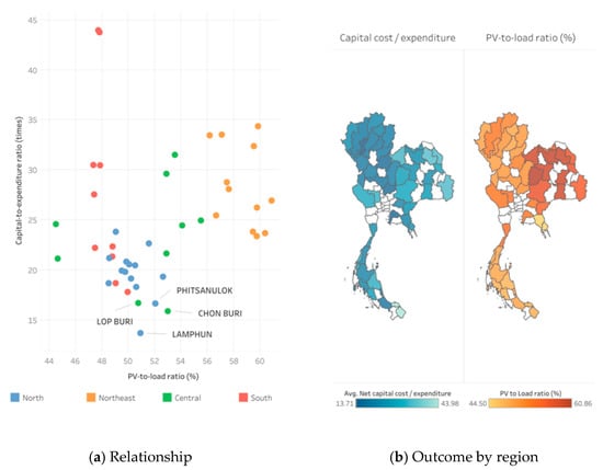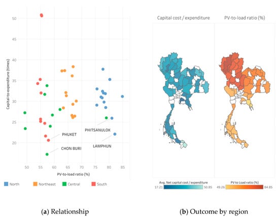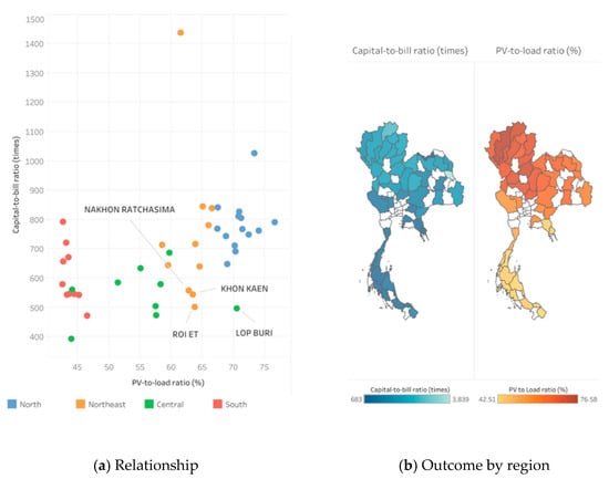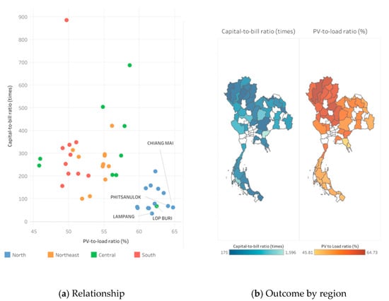 Second, the optimal PV size is converted to the associated PV-to-load ratio. The ratio indicates the potential financial impact to the utility in the area []. The PV-to-load ratio is then overlay with regional socioeconomic variables such as household income (for residential customers) or the level of industrial activity (for commercial and industrial customers). These socioeconomic variables serve as proxies for a customer’s wealth and for how easy it is to invest in the optimal rooftop PV in different regions. Investments in the rooftop PV are assumed to be made in 100% cash, as there are presently limited financing options in Thailand’s nascent rooftop PV market. As financing options expand and investment becomes easier, the likelihood of PV adoption in Thailand will increase.