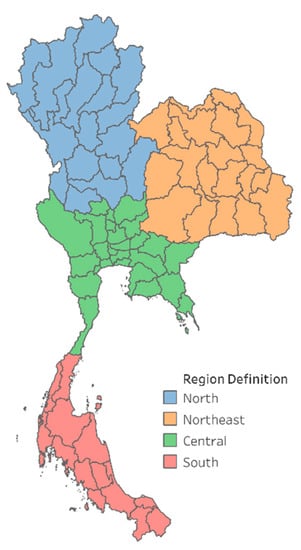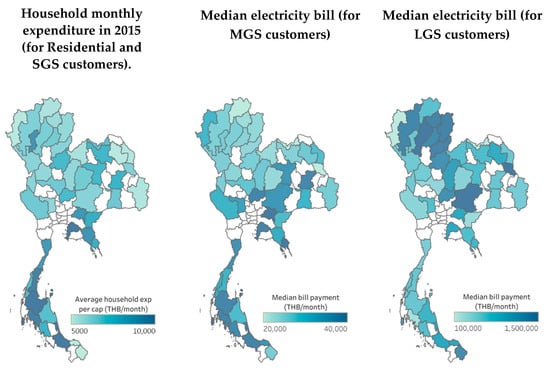 The regional socioeconomic data in this study come from two different sources. The province-level average household monthly expenditures per capita (used as a proxy for residential and SGS customers’ wealth) in 2015 come from Thailand’s National Statistical Office []. The province-level median per-meter electricity bills (used as a proxy for MGS and LGS customers’ economic activity) come from the PEA.