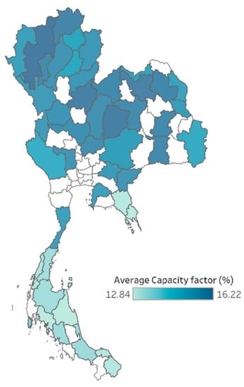Figure 4 shows the average capacity factor for a modeled rooftop PV system in provinces where weather data is available. The figure reveals that PV productivity is highest in the northern and northeastern provinces and lowest in the southern provinces. Table 1 shows the average capacity factor across the four regions.