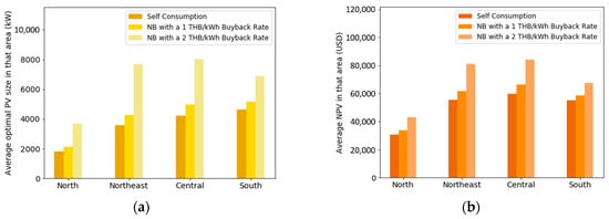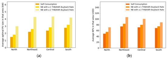 Like residential customers, SGS customers in each region are induced to install larger PV systems as the buyback rate for excess generation increases. Under the block rate with a buyback rate of 2 THB/kWh, average optimal PV sizes across all regions are approximately the same but the average NPV varies. The average NPV is highest in the Northeastern region followed by the Northern, Central, and Southern regions, respectively (Figure 8). A buyback rate of 2 THB/kWh likely induces all SGS customers to install larger PV systems to gain benefits from surplus PV generation. It is likely that surplus PV generation depends heavily on geographical capacity factor, as average consumption during the day for SGS customers does not vary significantly by region. Variation in capacity factor leads to the average NPV ranking stated above.