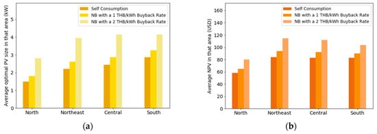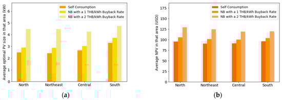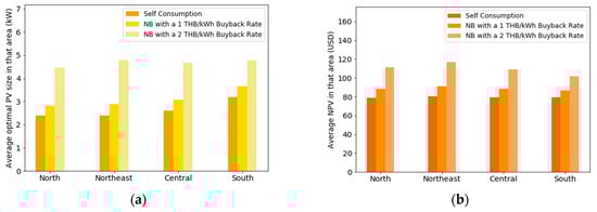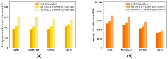 If the buyback rate is below 2 THB/kWh, though, average NPVs stay the same across all regions while average optimal PV sizes are larger in regions with the lower capacity factors. This is likely because a lower buyback rate results in the geographical capacity factor assuming more weight in the determination of optimal PV size.
