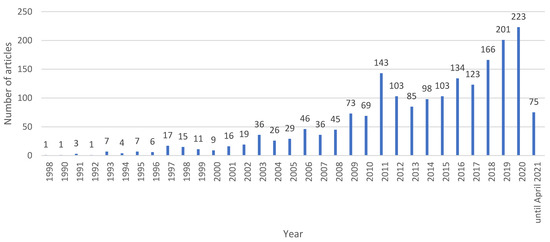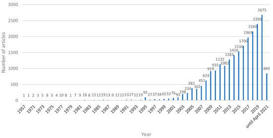 Publications on corporate social responsibility according to the SCOPUS database for the query corporate AND social AND responsibility. Source: Own study based on data from Scopus database (accessed on 1 April 2021).
