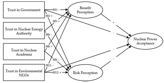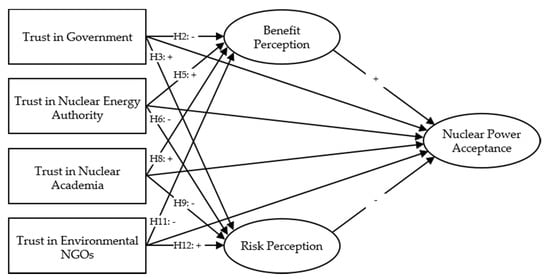 In addition, we develop hypotheses on the effects of trust in actors other than government. In studies adopting or consistent with the trust–acceptability model, the target of trust tended to focus on actors who have the direct authority to make decisions about the introduction and regulation of a technology (i.e., government [,]). However, as modern societies have diversified, many other actors have also become involved in the construction of the public’s perceptions of the benefits and risks of technology, which has affected their acceptance of said technology. In line with this, several studies have expanded the range of targets of trust to various actors in societies such as industry players, scientist/researcher groups, and non-governmental organizations (environmental groups) [,,]. Thus, we also consider the effects of trust in these actors.