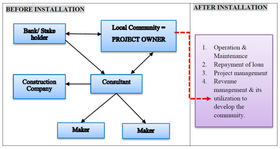 Figure 2 represents the responsibilities of each stakeholder toward development and execution of the project. It shows the strong initiative and struggle done by the local community for self-sufficiency in energy production. It also encourages the community to manage its available renewable energy resources along with local commons [23].