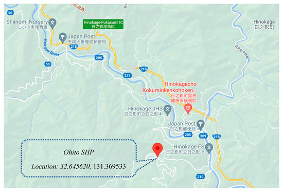 This section discusses with the case study of the development of 50 kW Ohito small hydropower plant. This SHP has been installed in Ohito agricultural cooperatives owned by residents. Figure 3 shows the location map of Ohito SHP, which comes under Hinokage town in Miyazaki Prefecture. As per 1 October 2019 data, the estimated population of Ohito community is 3656 people (men and women). The total field area is 277.67 km2. It is located next to the historically significant town of Takachiho. Hinokage town is known primarily for its three large modern bridges, traditional Kagura dances, and the work of Kazuo Hiroshima, a traditional weaver of bamboo baskets.