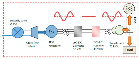 For this site, a cross flow turbine (made in Indonesia by Asosasi Hidro Bandung) has been selected with electrical equipment and a control panel (made in Japan). A high efficiency IPM generator with AC-DC converter (GD) and further on DC-AC converter (GC) have been installed as shown in Figure 7. It is a unique system that increases the system efficiency even on low output and low speed of the generator. An IPM generator is a high efficiency (~95%) varying speed generator, which is approx. 80% efficient at 25% of its rated speed. The combination of GD and GC helps to stabilize the output voltage and frequency according to the grid requirement.