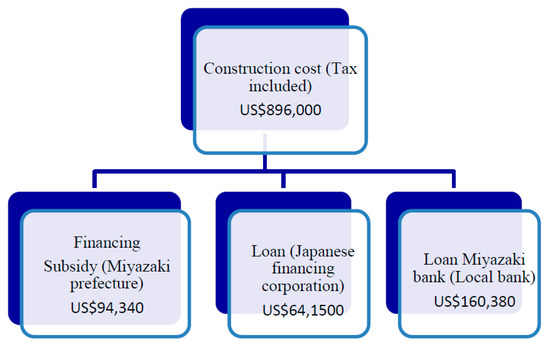 The Ohito Agricultural Cooperatives borrowed the loan from financing cooperation and banks. At the same time, they got a subsidy from the Miyazaki prefectural government. Figure 8 represents the construction cost and finance arrangement for the construction. The total cost of construction was USD 896,000. Out of which, USD 94,340 is subsidized by the government of Miyazaki prefecture. The others are arranged by the loan from the local bank of Miyazaki and Japanese Financing Corporation at the rate of interest 2.6% and 0.9%, respectively, within the repay period of 20 year, which is guaranteed by FIT.
