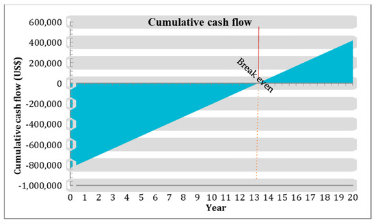 Figure 9 represents a cumulative cash flow estimation of Ohito SHP. The running cost was calculated as approximately USD 8500 per year. The results of economic calculation are as follows: Project IRR (4.3%), B/C ratio (1.36) and project payback period (13 years). In Figure 8, the x-axis shows the period. Since the FIT provided by the Japanese government ended for 20 years. The cost analysis was done for a 20 years period. The Y-axis gives the cumulative cost per year, which includes total earning−maintenance cost−loan payment per year. The breakeven will be achieved after 13 years by the calculation.