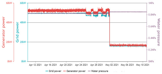 The energy output and power generation for the last month of 10 April 2021 to 10 May 2021 is shown in Figure 10 and Figure 11. It shows the variation of power output and power generation with the time. It shows that power output and energy generation was constant until 2 May 2021, and then afterwards, it reduced to 1/3 of designed output. Generator power and power going to the grid with respect to time and water pressure have been shown in Figure 9 and Figure 10. It has been seen that until 2 May 2021, the power output was 50 kW approximately, but after this date, the output decreased from 50 kW to around 17 kW. It is because the water is being used for irrigation purposes, which has priority over power generation. This shows a new community-based business of the Ohito community integrated in agriculture and hydroelectric generation at the local level.