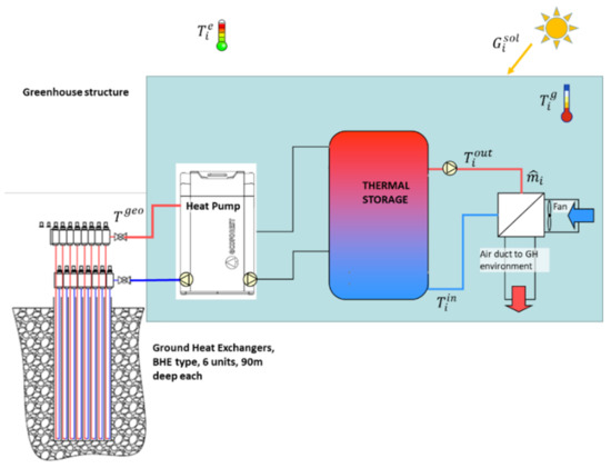The proposed architecture consists of the following components. For heating and cooling purposes, the GCHP is connected to an Air Handling Unit (AHU), fed by hot (or cold) water. As it is well-known, the COP (Coefficient of Performance) refers to the ratio between the units of heating energy generated for every unit of electrical energy spent to operate the system [