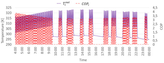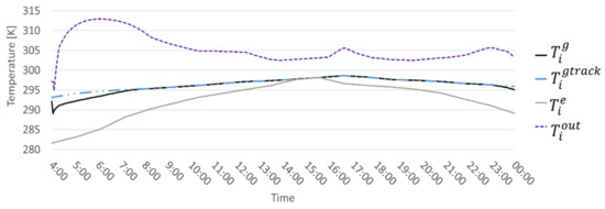 In particular, Equation (2) shows the relationship between the state variables associated to indoor greenhouse temperature and the others main components due to internal and external variables. The superscripts g, e, mint refer to the variables related to the temperatures, respectively, associated to the greenhouse, to the external conditions and to the inner masses. The main contributions are due to the heat losses through the glazed envelope, the heat transfer between air and the internal masses of the greenhouse, the solar gains and the heat provided by the plant by means of the AHU. This energy balance is intrinsically time-dependent, because the external air temperature and the solar irradiance change continuously during the day, depending on the season. Equation (4) allows to evaluate the evolution in time of the water temperature at the load side of the GCHP (the stream that exits from the heating coil of the AHU). On the contrary, due to the peculiar characteristics of the greenhouse site (the presence of a double aquifer at some 10 and 80-m depths, respectively) measured values of the carried liquid temperature, the ground side was demonstrated to be very constant in time, and this is the reason for setting it as a constant in the present model. In Equation (4), the estimated heat transfer coefficient of heat exchanger water/air in the AHU is considered; in fact, the decrease of water temperature is proportional to the heat transferred to the air in the AHU heating coil , evaluated as in Equation (7). Equation (5) is the definition of the performance parameter COP for the GCHP. Due to numerical constraints, the variable has been top-limited by the value in Equation (6). The range of the GCHP efficiency depends on the hot water temperature exiting from the heat pump and from the temperature of the water coming from the ground, respectively. The variable is defined in Equation (7) by the heat transfer formula, which is the measure of the thermal energy transferred by the GCHP water according to the outlet and inlet water temperature variations. In detail, the heating power of GCHP is given by the product of the mass flow rate of the water circulating in the pipe and the related specific heat of water and the temperature difference. Equations (8) and (9) introduce a maximum threshold for the variables associated with and due to physical and numerical constraints. In Equation (10), the value of , (i.e., the supply temperature of the GCHP) is forced to be ∆Temp over , the temperature of water returning from the greenhouse if the pump is activated, or to be equal to otherwise. Finally, Equation (11) represents an upper limit for the variable associated to the mass flow rate of the water circulating in the GCHP pipe.