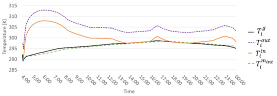 In the above set of equations, Equations (2) and (3) represent the energy balances for greenhouse air (of temperature and internal masses (of average temperature ), respectively.