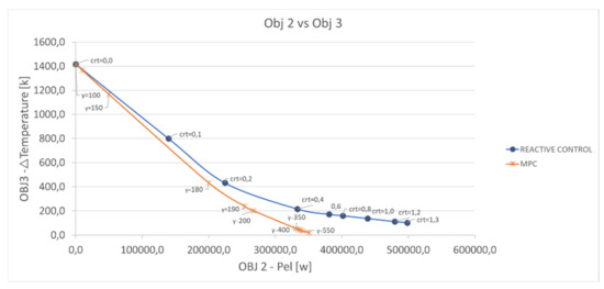 MPC tuning was examined with several values of weighted parameters in the multiobjective cost function to achieve the optimal setting for the controller’s performance. Subsequently, a classical relay control was applied to the same model. The parameters of the on/off controller were varied, and the results were compared with those obtained using the MPC controller in terms of the two components of the cost function that were the minimization of the electric power consumption and the divergence of the indoor air temperature with respect to the predefined one. The results indicated that the Pareto front associated with the MPC controller dominated the relay control one in all simulations.