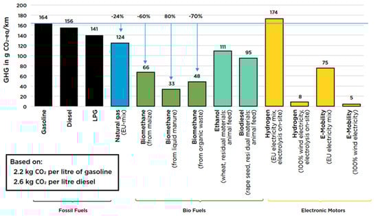 Research papers on biomethane are significantly scarcer. This is due to the fact that in many countries, due to the lack of infrastructure for upgrading biogas to biomethane, this fuel is still unavailable. The conducted research work primarily concentrated on the impact of biomethane on the environment (the emission of particulates and gaseous substances, in particular), relative to fuel with natural gas [,]. Authors of [] concluded that the use of methane fuels significantly reduces emissions compared to fossil fuels. The GHG emissions for gasoline, diesel fuel and LPG in the whole life cycle are estimated at 164, 156 and 141 g CO2-eq/km, respectively (Figure 1). For biomethane, it is only from 33 to 66 g CO2-eq/km (depending on the raw material used), and for natural gas, 124 g CO2/km in the whole life cycle.