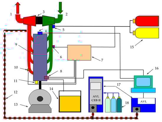 Scheme of the test bench, where: 1—exhaust outlet, 2—air inlet, 3—turbocharger, 4—crankshaft angle sensor, 5—gas fuel injector, 6—boost pressure sensor, 7—fuel electronic dosage control module, 8—cylinder pressure sensor, 9—engine, 10—thermocouple, 11—knocking combustion sensor, 12—heating pipes supplying exhaust gas to the analyzers, 13—AVL electric brake, 14—liquid fuel tank, 15—methane fuel tanks, 16—computer, 17—exhaust gas analyzers, 18—reference gases.