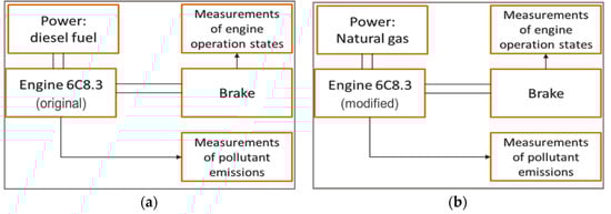 Schematic representations of the engines’ test bench are shown in Figure 3.