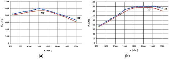 External speed characteristics of Cummins 6C 8.3 engine: (a) torque and (b) effective power, for a self-ignition, diesel-fueled engine (DF), and a spark-ignition, methane fuel—natural gas—supplied engine (MF).
