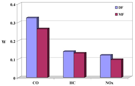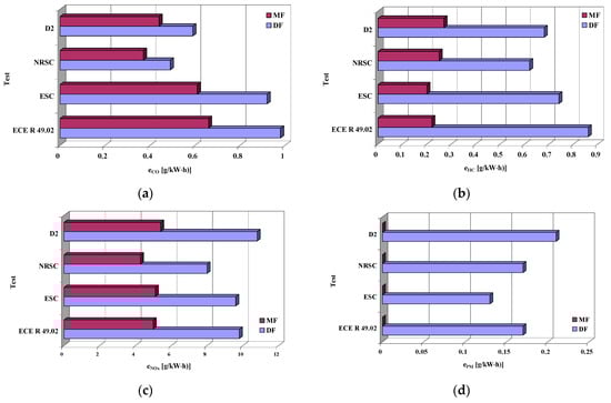 Specific brake emission: (a) carbon oxide, (b) hydrocarbons, (c) nitrogen oxides and (d) particulates, in tests for a self-ignition Cummins 6C 8.3 engine running on diesel fuel (DF), and a spark-ignition Cummins 6C 8.3 engine running on methane fuel—natural gas (MF).