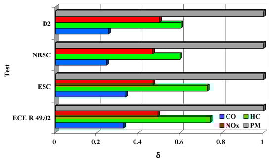 The test studies, which concerned the pollutant emission (carbon oxide—CO, hydrocarbons—HC, particulate matter—PM and nitrogen oxides—NOx), corresponded to the static operating states of the engine. The basis test is the D2 test for studying the emission of pollutants from internal combustion engines used to drive power generators with variable load, as per the ISO 8178-4 standard []. For comparative purposes, the authors also conducted studies within other static tests [,]: