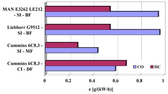 Specific brake emission of carbon oxide and hydrocarbons in the D2 test for the studied engines running on diesel fuel (DF), methane fuel—natural gas (MF) and biogas (BF).
