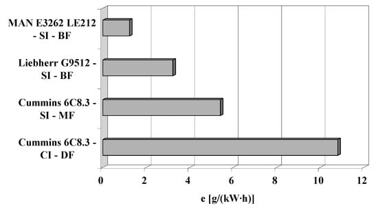 Figure 10 and Figure 11 show the specific brake emission of carbon monoxide, hydrocarbons and nitrogen oxides within the D2 tests of the studied engines in the conditions of the homologation test of engines used for driving power generators: MAN E362 LE212, Liebherr G9512, fueled with biogas, and the Cummins 6C8.3 engine: in the original version of the self-ignition engine, fueled with diesel, and in the modified version as an ignition engine spark plug fueled with methane fuel (natural gas).