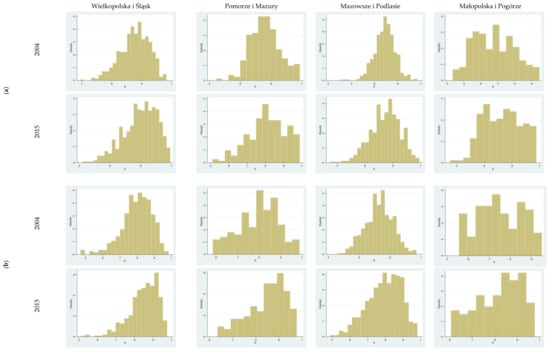 Having calculated the rates of technical efficiency based on the built model, average efficiencies were determined for individual overinvestment groups in Polish regions for 2004–2015. The averages were also calculated for marginal years, which enabled the estimation of changes in the technical efficiency of individual farms. To indicate even more precisely the changes taking place, rate histograms were also created for marginal years, which enabled not only the comparison of averages but also the analysis of changes in their distributions. In summary, regional diversity of technical efficiency in agriculture as a results of an overinvestment was measured as shown in Figure 2.