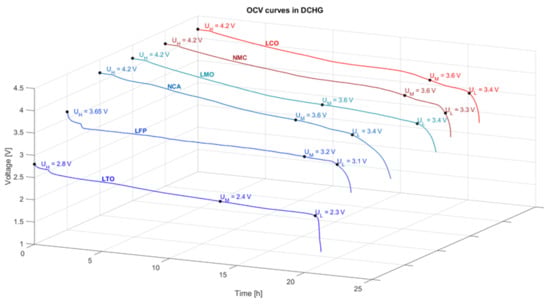 One cell of each chemistry was charged and discharged with a very low current of C/20 (relative to the nominal capacity) after being current constant voltage (CCCV) charged to their upper voltage limits with a cut-off current of C/50. The comparative OCV overview for all electrode materials is shown in Figure 1, with a one-hour waiting phase in the beginning. LFP and LTO cells have a slight decrease in their OCV during this period. Here, the three different storage voltages UL, UM and UH, which are also referred to in Table 2 for the aging procedures, are highlighted in each OCV curve. Each voltage represents the designated storage voltage of a given cell chemistry.
