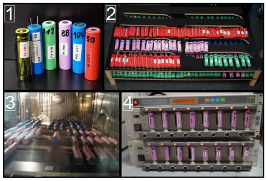 Initial cycles on all cells were performed, to reduce the effect of initial behavior of new battery cells, i.e., the capacity rise during the first few cycles [4] and thus to better examine the impact of aging on the long-term performance. All the cells were clamped into the cylindrical cell holding mechanism of the battery tester (Neware BTS 4008-5V6A, accuracy ±0.05% of full scale for both current ranges: 0.5–100 mA and 0.1–6 A and for voltage 25 mV–5 V [14]), as can be seen in Figure 2 in the fourth panel. The lithium-titanate-oxide (LTO) cells have two pins on a single side and thus could not fit into the cell holder, as visible in Figure 2 in the first panel. These cells were connected via a cable with crocodile clamp adapter. Both adapter and cylindrical cell clamps are equipped with four-wire measurement capability.