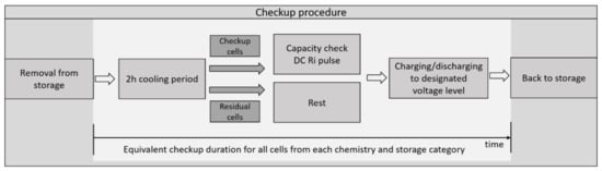 During the aging procedure, only a certain amount of cells can be verified, which are marked as ‘Checkup cells’ in Figure 3, due to a limited quantity of test channels. This quantity of checked cells consists of five cells per chemistry at every condition, except for all cells at room temperature and for LTO, which consists of three checkup cells. Therefore, the other leftover cells of the same aging group are also taken out, but only for recharging to their dedicated storage voltage with the same cutoff condition as in the beginning, as can be seen in Figure 3. This process is used in order to have as little time as possible for all cells outside of the elevated temperature storage. After both procedures are finished for all cells of the same aging group, they are put back in the temperature chamber. The cell group that only got recharged cannot be used for the intermediate data points in the further evaluation, but they were included in the first and in the last data point for all plots and calculations.
