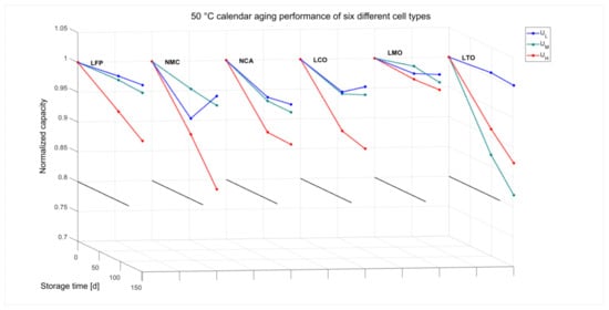 The capacity decrease of the 18 different batches at 50 °C, divided into six chemistries with each three storage voltages, can be seen in Figure 4. Here, the average of every capacity at every storage condition and time is displayed. For the first and last data point, the amount of checked cells resembles the amount displayed in Table 2, whereas all intermediate points consist of five cells for all voltages and chemistries, except for LTO where this number is three, as a lesser total amount of those cells was available. Due to channel limitations and the relative short time the cells should stay outside of the climate chambers, not all cells were checked, as explained previously.