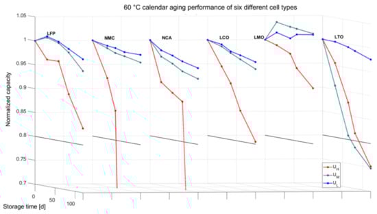 As the cells are set by voltage, UL corresponds to a relative SoC of 2–6%, except for NCA, where it is at 17%. The voltages for the cells with a voltage window up to 4.2 V, i.e., NCA, NMC, LCO and LMO, were set to 3.4 V in order to have a small distance to the lower cutoff voltage and to avoid possible over-discharging at longer storage periods. UL for NMC was set 0.1 V higher, as the voltage plateau is comparably flat at 3.3 V. Similarly, the second storage voltage UM corresponds to a SoC from 17–38% accordingly and was set to 3.6 V for the four previously mentioned cell types each, as this voltage fits to the nominal voltage of the cells. For LMO and LTO, which have different voltage windows anyway, UM was set to the nominal voltage and UL was picked with a small gap to the lower cutoff voltage. On the other hand, UH corresponds to a 100% SoC for all cases.