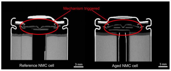 When contacting the cells with a multimeter (UNI-T UT61E), the voltage of all cells that show values above 0 V but below UMin, i.e., the dead cells, dropped further due to the small measurement current of the multimeter. This leads to the conclusion that this observed voltage is somewhat of an open circuit voltage with a rather high internal resistance. A possible explanation would be the triggering of a safety mechanism (CID) during the aging. In order to explore this cell failure further, CT scans were conducted with NCA and NMC cells, respectively. Dead NMC and NCA cells, that were aged at 60 °C and UH were scanned and compared against unaged reference cells. Figure 6 gives a comparitive overview of two NMC cells, with the left cell being aged at room temperature ((18.5 ± 2.5) °C) NMC and the right cell being an aged cell a few days after the failed checkup. It can be clearly seen that the safety mechanism has been triggered as a cause of gas generation due to the accelerated aging. This also explains, why no or only a highly resistive OCV of the dead cells is measureable, as the contact to the cell wrap is partly or completely disrupted. From a visual inspection, a release of the gas could not be identified, only that no clear changes such as deformations etc. are not visible from the outside inspection.