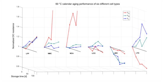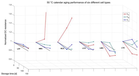 The LMO cells show a pattern that is comparable to their capacity behavior, being that their resistance first goes down and eventually stabilizes at the end of aging. This effect can also be connected to the fact that more initial cycles could compensate for this initially inverted behavior. The last cell group LTO shows more increase at lower storage voltages, i.e., at UL and UM. Cells stored at UH even decreased in impedance over time, compared to the initial measurement.