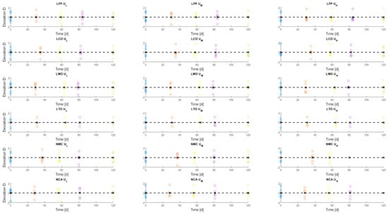 Figure 9 shows the variation of the deviation of every checked cell during the aging steps at 60 °C storage. 60 °C cells were selected for analysis, as there are more intermediate data points and capacity decrease is more pronounced, therefore the expected changes are also expected to be more pronounced. Each line displays the set of a single cell chemistry at different storage voltages, as explained in Table 2, whereas a row-by-row comparison features the changes between chemistries. The black dotted line, representing the expected value is inserted to make changes in the set at later data points more visible and to guide the eye.
