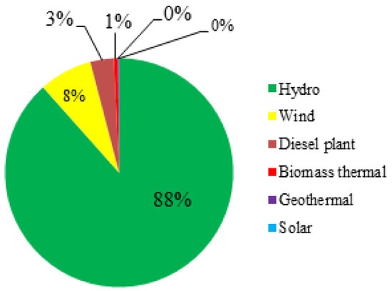 World economies are highly reliant on energy. However, in many developing countries, access to an electric supply system is still a particular concern. Ethiopia is one such country, situated in East Africa with a surface area of 1,127,127 km2 and a population of about 109 million at the end of 2019 [1,2]. In 2018, only about 45% of the total population had access to electricity [3], and the current electric power consumption of the country is overly dependent on hydropower, as shown in Figure 1 [4,5]. Due the continual growth of the population in the country and on account of the climatic influences on the hydropower segment, the country has been in an electric power shortage for long period. Electric power outages are experienced in the country every other day. According to some reports (e.g., [6,7]), the yearly average number of interruptions in the country is estimated to be around 102, with the average outage duration lasting 70 h. In order to withstand these outages and to get a reliable power system, most firms in the country use diesel fuel as a power source [8]. However, a diesel generator has its own drawbacks, such as the high associated cost and CO2 emissions.