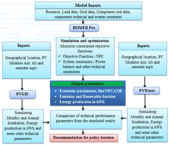 HOMER (Hybrid Optimization Model for Electric Renewable) is a computer simulation tool, which was developed by the NREL and is appropriate for carrying out viability, optimization and sensitivity examinations of grid-tied and off-grid supply systems with any combination of power sources [49]. This tool utilizes inputs like climate data for the specified sites, different technology alternatives, component price, grid, load demand data, and the lifespan of the project to simulate various scheme alignments. After the user-defined decision variable values are given as an input, the HOMER Pro algorithm considers each probable combination of resources and simulates all viable configurations that can meet the required system demand and constraints in each time step of the year. In the outputs, viable configurations of the system are shown according to their NPC in ascending order. HOMER takes NPC as the objective function and power balance as the system constraints in its optimization algorithm. The system that meets the load demand with the lowest NPC is taken as the optimal [50,51]. HOMER Pro version 3.10, which performs all the stated tasks, was used in this study. Figure 3 indicates the flowchart of the HOMER Pro tool’s structure with the other (PVGIS and PVWatts) software packages. Some of the limitations for this tool are: