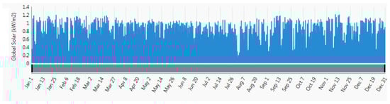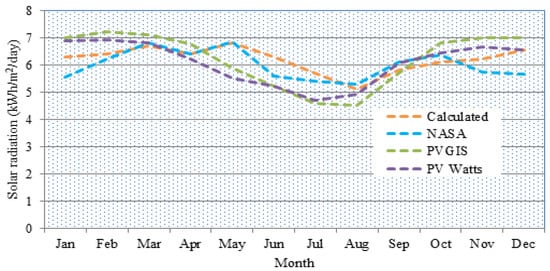 Based on the above Equations (6)–(10), the solar irradiation of the location was analyzed. The calculated yearly average irradiation for the site is 6.15 kWh/m2/day. To validate the calculated result, the PVGIS, PVWatts and NASA databases were also used. The yearly average irradiation data obtained from PVGIS, PVWatts and NASA for the location were 6.10, 6.08 and 5.99 kWh/m2/day correspondingly.